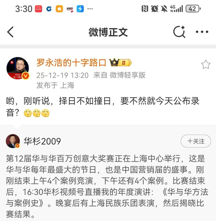 12月19日,中国营销界的盛事——第12届华与华百万创意大奖赛正在上海中心火热举行。罗永浩直接转发华杉的赛事动态隔空喊话:“哟,刚听说,择日不如撞日,要不然就今天公布录音?”这一突然“逼宫”,让原本聚焦赛事的网友瞬间将注意力转向这场跨界纠葛。